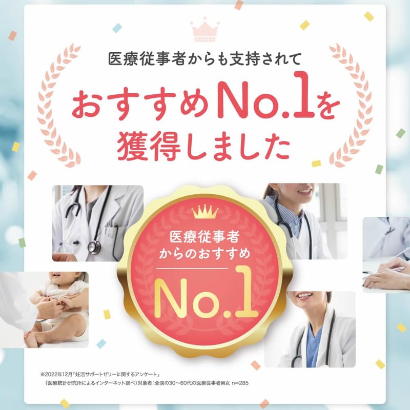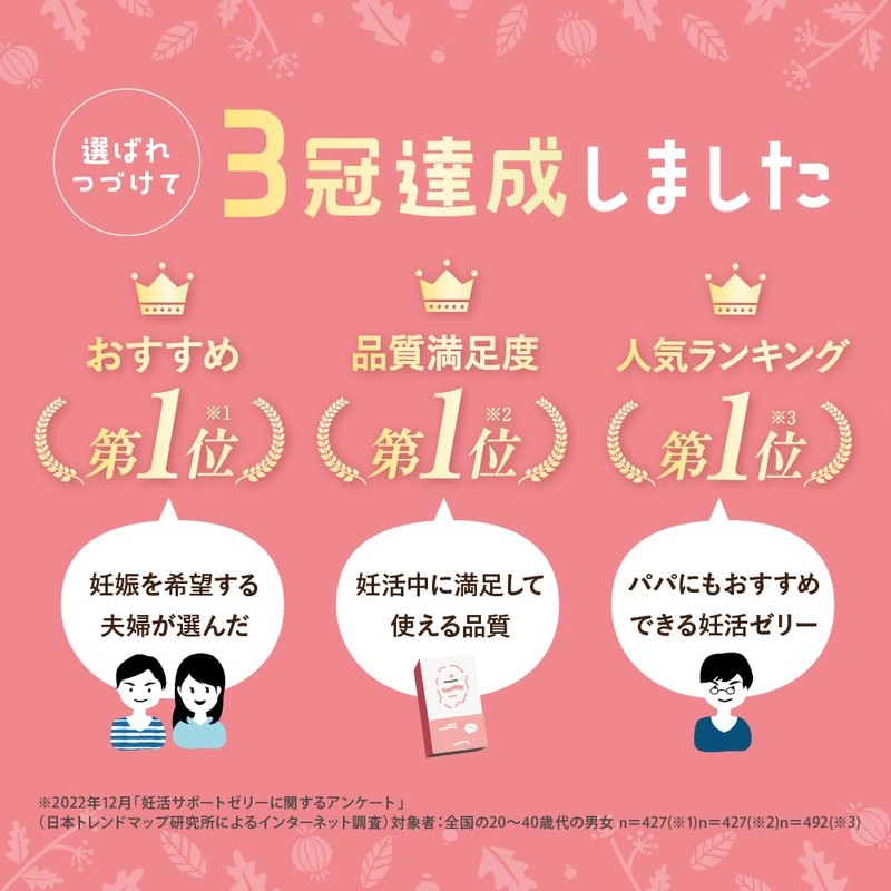 - 妊活サポートゼリーとして「3冠」を獲得し、医療従事者からの「おすすめNo.1」にも選ばれたピンクゼリー。おかげさまで発売開始よりシリーズ100万本を突破しました。