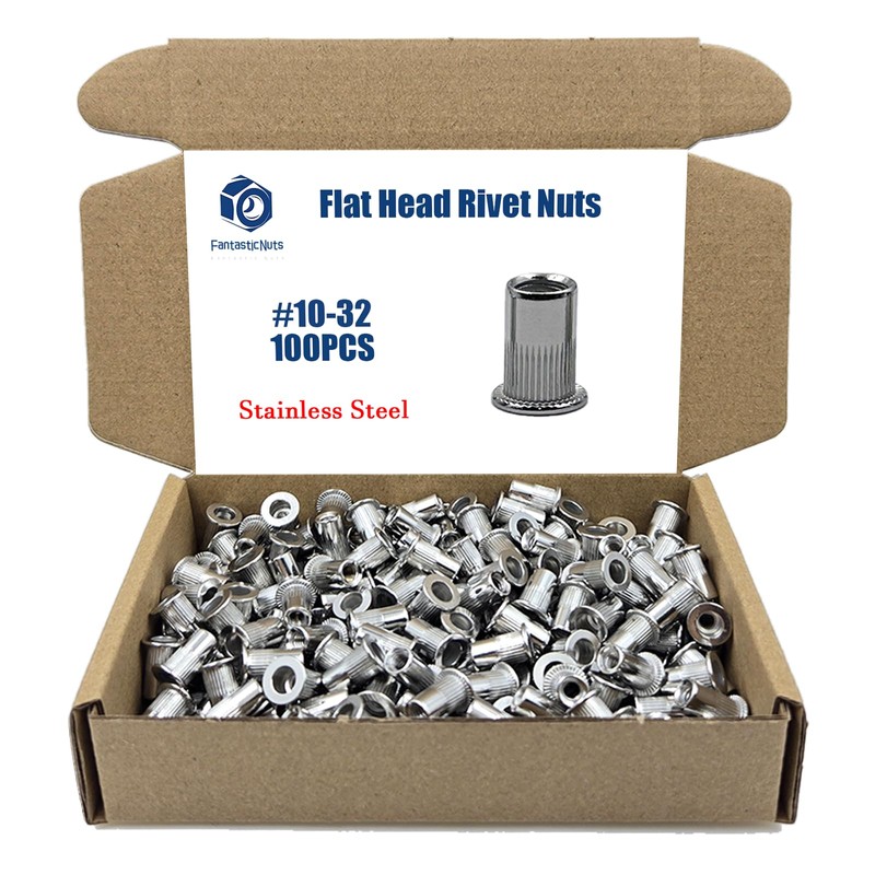 #10-32 100PCS SAE Rivet Nut Ass 304 Stainless Steel Flat Head Threaded Rivet Insert Knurled Rivet Nuts