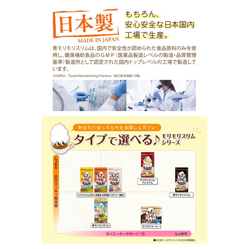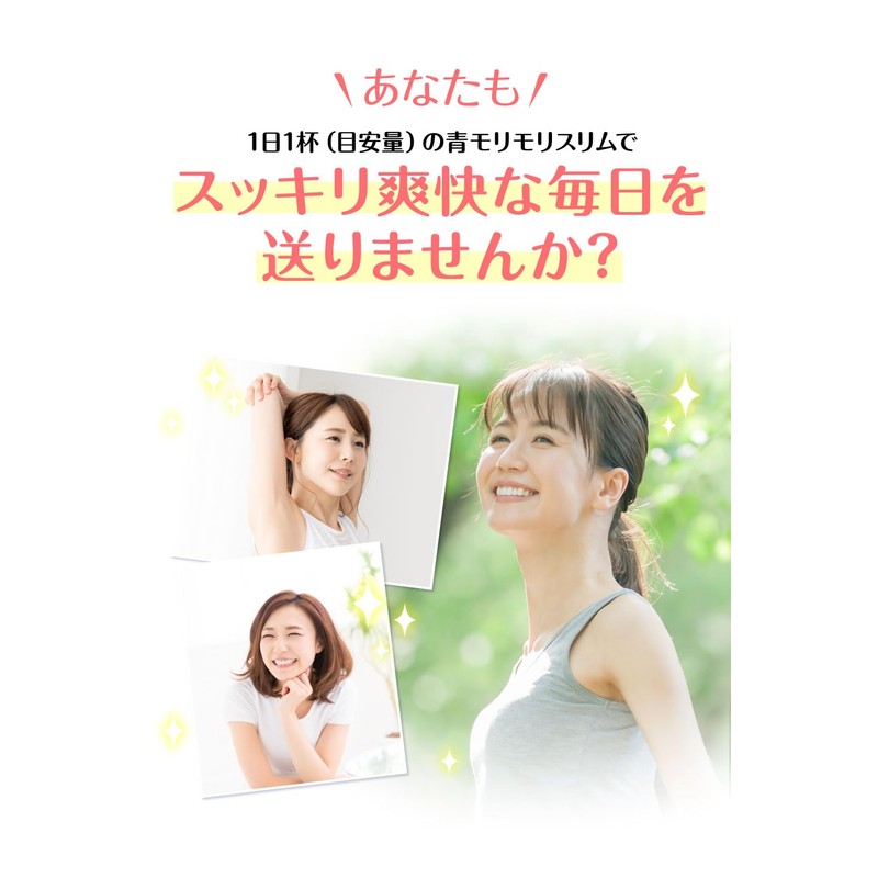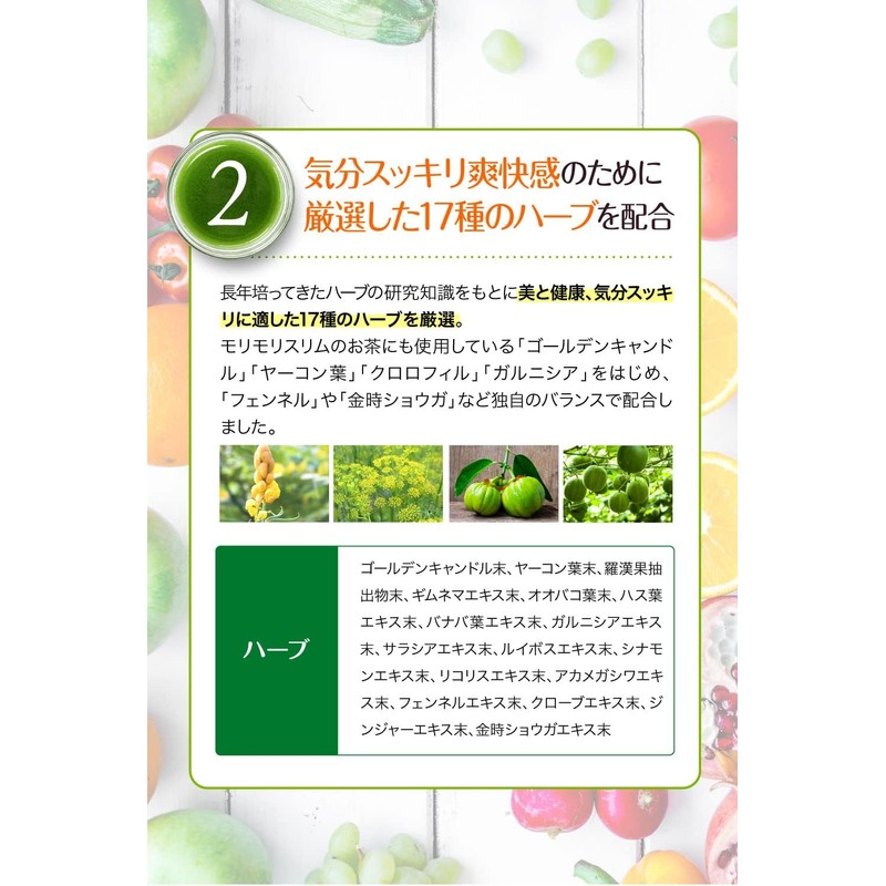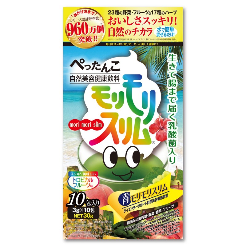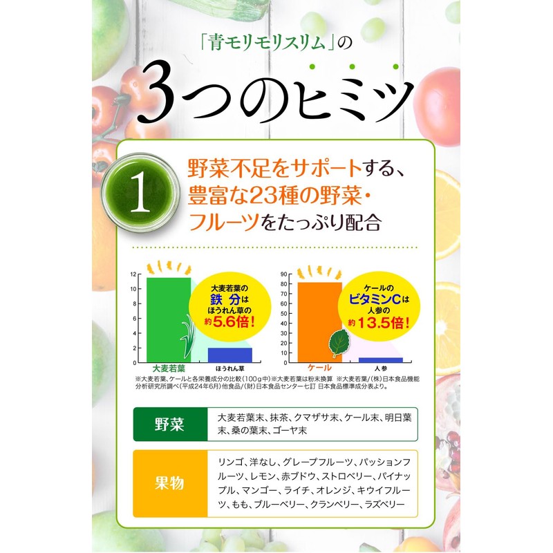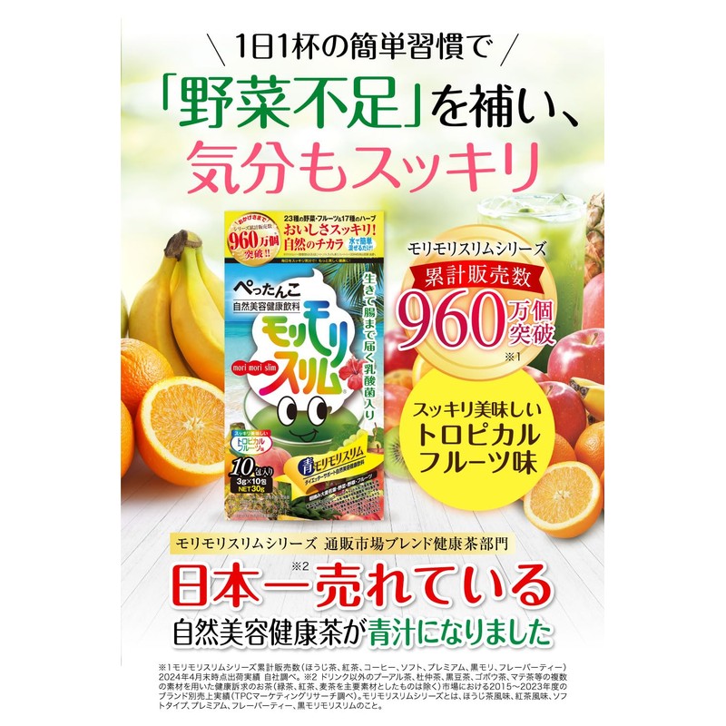 - 「青モリモリスリム」は、発売から960万個(*)以上の実績を誇る、自然美容健康茶モリモリスリムの青汁バージョンです。新鮮な九州産の朝摘み大麦若葉をベースに、厳選した40種の野菜・フルーツ・ハーブを独自のバランスで配合。さらに、生きて腸まで届く乳酸菌もプラスして、「野菜不足」と「スッキリ気分」をWでサポートする、一石二鳥のおいしいフルーツ青汁です。野菜不足を補うために、そして、スッキリ爽快な気分のために、毎日飲んでも飽きのこないトロピカルフルーツ味の自然なおいしさをお楽しみください。 (*モリモリスリムシリーズ累計販売数(ほうじ茶、紅茶、コーヒー、ソフト、プレミアム、黒モリ、フレーバーティー)2024年4月末時点出荷実績 自社調べ。)