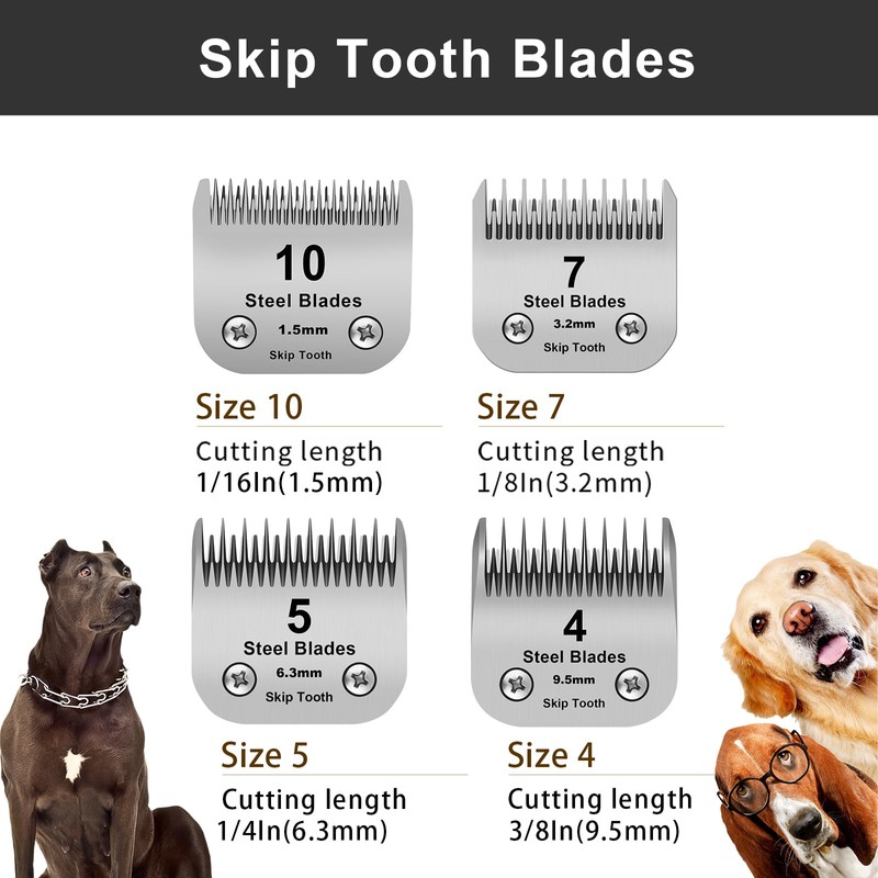 10+7+5+4 Skip tooth Detachable Pet Dog Grooming Steel Blades Set,Compatible with Andis,Oster A5,Wahl KM10 Series Clippers,Cut Length 1/16"(1.5mm) to 3/8”(9.5mm),4 Pack (10+7+5+4 Skip tooth Blade)