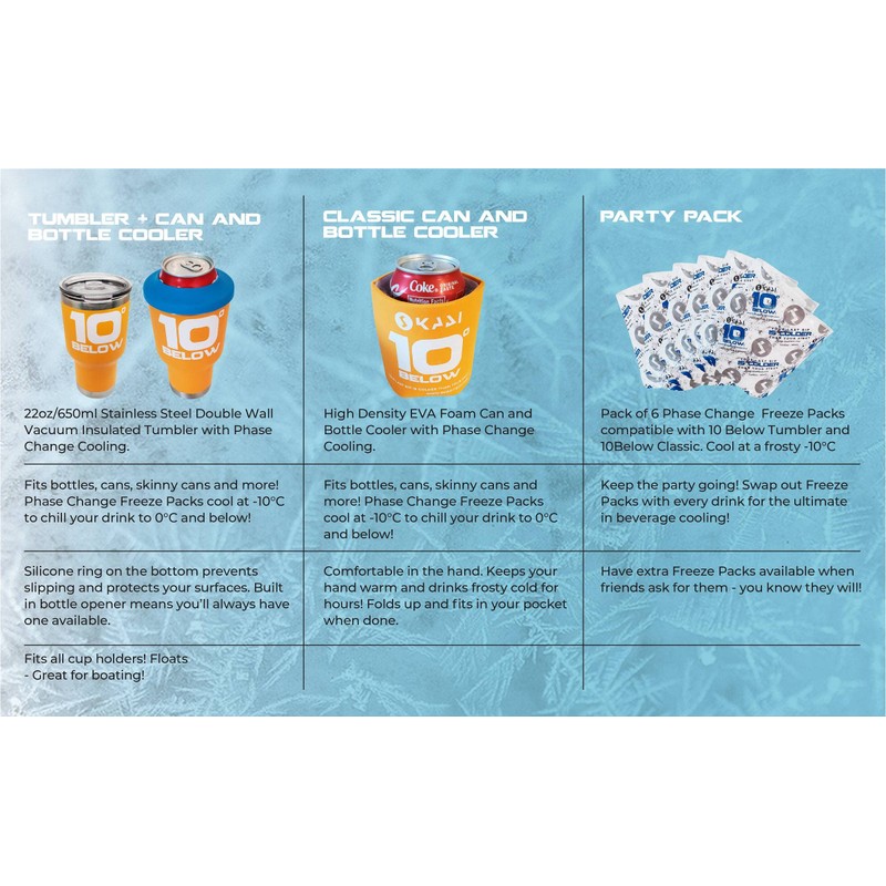 - BOTTOM OF THE ICE CHEST EXPERIENCE: Don't just insulate! Swappable freeze packs surround your drinks with subzero temps chilling them to ZERO and BELOW! Get that bottom of the ice chest experience every time!