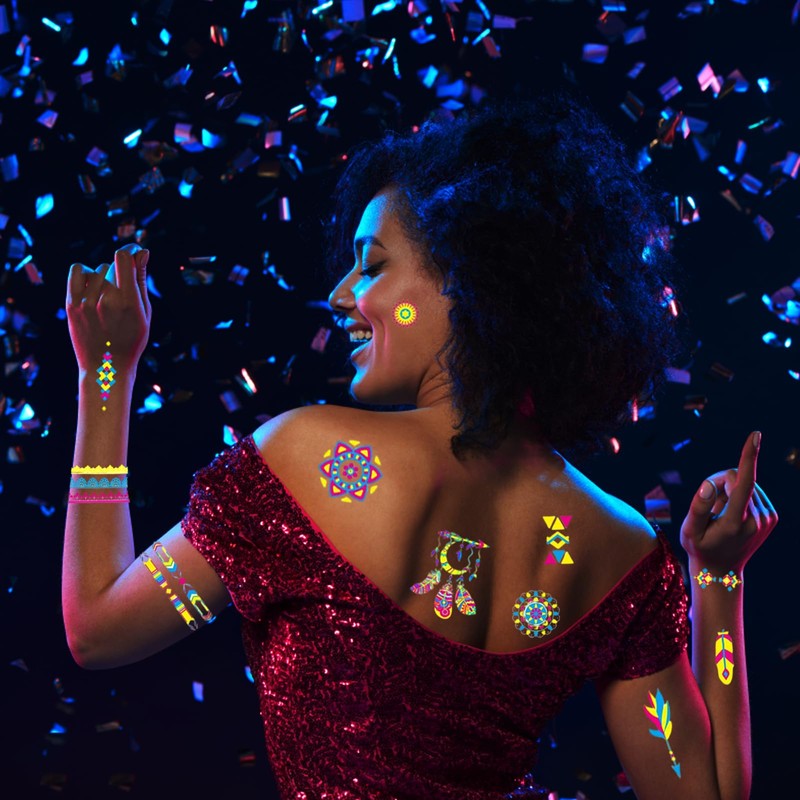 - 【Perfekt für Jeden Anlass】: Perfekt für Halloween, Weihnachtsfeiern, Sommerfeste oder Cosplay-Abende. Egal, ob Make-up-Liebhaber oder Glow-Up-Anfänger –mit diesen UV-Tattoos strahlst du unter Schwarzlicht und ziehst überall die Blicke auf dich.