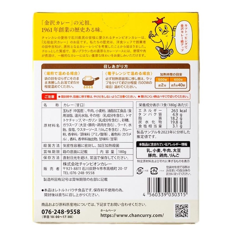 Based on the recipes of Champion Curry, Yoshikazu Tanaka, the founder of the Champion Curry was invented in the kitchen of a western restaurant, we made it to reduce spiciness. The "sweet mouth", so it can be enjoyed by children or those who don't like spicy. Please enjoy the "curry sauce" that has been trained in Kanazawa's food culture. Makes a great gift.