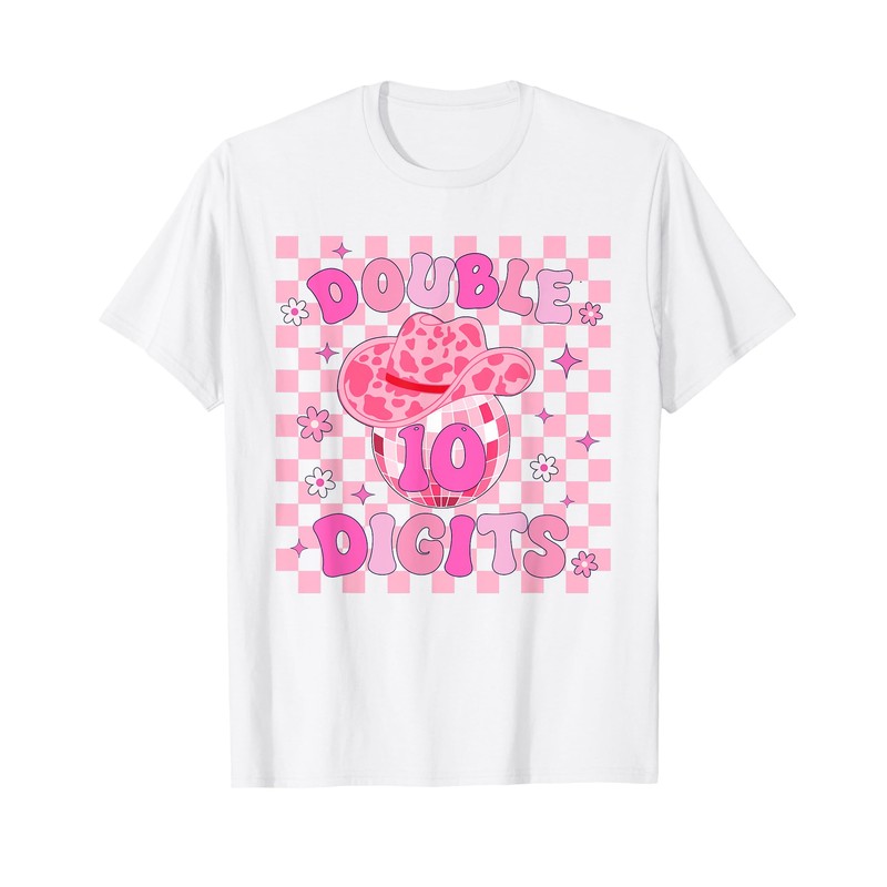 - Celebrate the tenth birthday with this cute and trendy double digits birthday shirt! Featuring a disco ball and cowgirl hat in retro groovy style, this shirt will surely delight your birthday child! Hilarious 10th birthday gift for 10 year old cowgirl