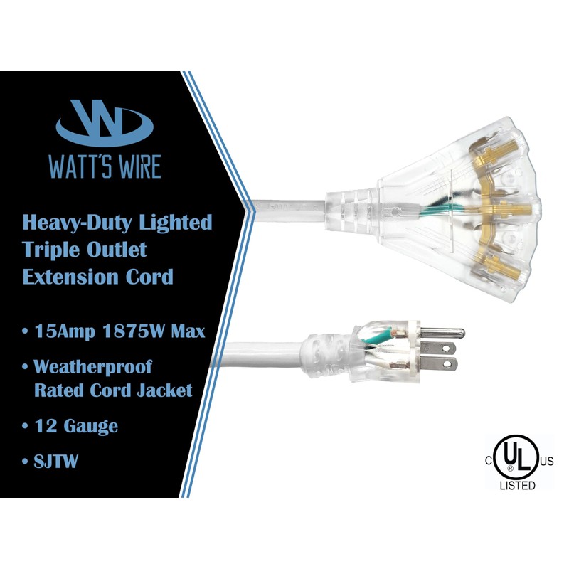 10 ft - 12 Gauge Heavy Duty Extension Cord - 3 Outlet Lighted SJTW - Indoor/Outdoor Extension Cord by Watt's Wire - 10' 12-Gauge Grounded 15 Amp Extension Cord Splitter
