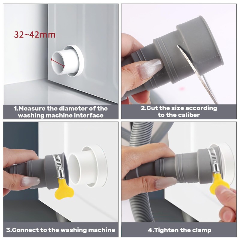 - Hassle-Free Installation – No Tools Needed:Designed for quick and easy DIY installation, this washer drain hose extension can be cut to size and slipped into place with minimal effort. The molded elbow outlet fits seamlessly into the end of the hose, and optional hose clamps can be used for extra security