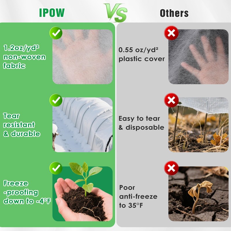 - 【Premium 1.2 oz/yd² Breathable & Water-Permeable Non-woven Fabric】 IPOW frost cloths for outdoor plants allows air, water, and sunlight (up to 70%) to pass through, distinguish with the plastic sheeting that traps moisture and causes break, so you don’t need to remove it daily. Perfect for floating directly over plants or securing over raised beds and frames.