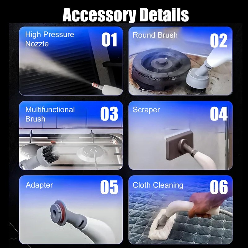 Equipped with 7 versatile accessories (nylon brushes, brass brushes, extension rod, glass brush), this multipurpose steam cleaner handheld tackles everything from windows to hard-to-reach corners. Its trigger control and chemical-free operation make it safe for kids and pets, while the durable ABS material ensures long-lasting performance.