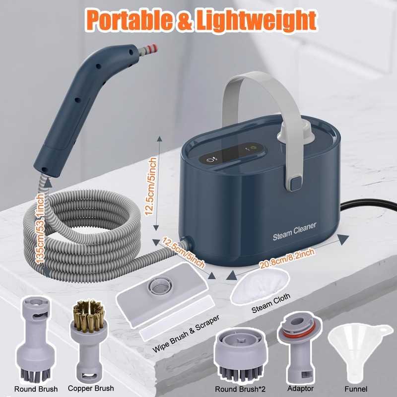 Featuring a 2-level adjustable handle and a compact, portable design (7×6×5 in), the hand held steam cleaner is perfect for use at home, in the office, or on the go. The 0.6Quarts (650ml) large water tank ensures extended cleaning time, while the 10-second heat-up lets you start cleaning instantly.