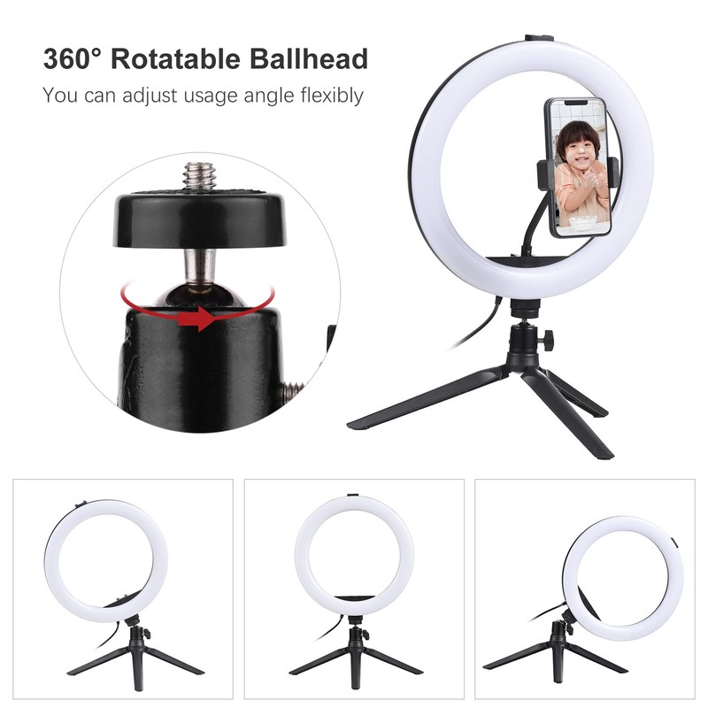 • 【Flexible & Stable Usage】Comes with a mini tripod, you can place the ring light on desktop for more convenient usage, and the rotatable ballhead adapter allows you to adjust angles flexibly. Also including a phone holder (5.9cm-8.5cm adjustable width), you can install smartphone to the ring light easily.
