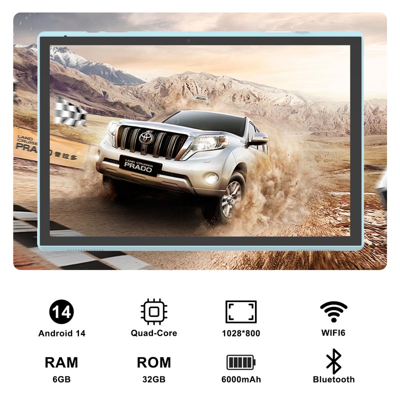 - 【Android 14 Tablet】10 inch Tablet PC is equipped with the latest Android 14.0 system, built-in powerful Quad-core processor, 32GB ROM 6GB RAM(Including 4GB expansion), 1024GB expansion, support Wi-Fi, Bluetooth, GPS and more, enough memory allows you to store more favorite e-books, movies, music, pictures, videos, games