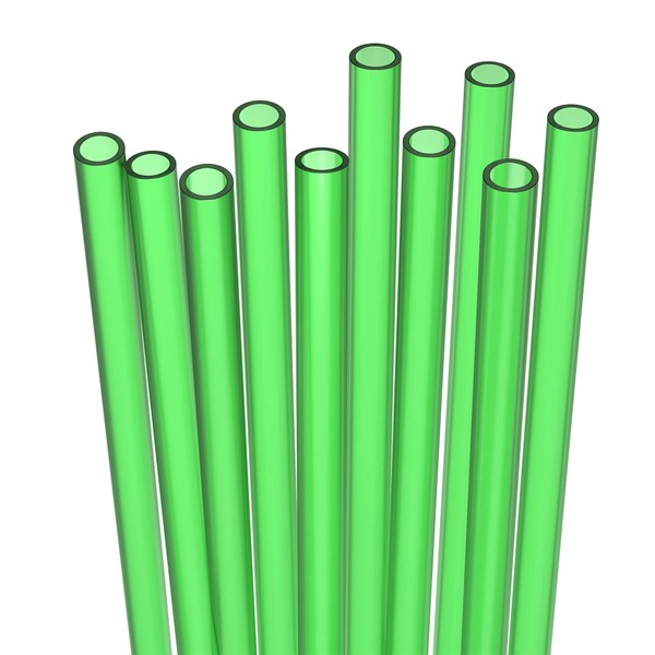 10 Long Reusable Hard Green Plastic Drinking Straws, Medium Width + Sturdy Cleaning Brush - for Tumblers, Mason Jars, Milshakes and Smoothies - Dishwasher Safe BPA Free