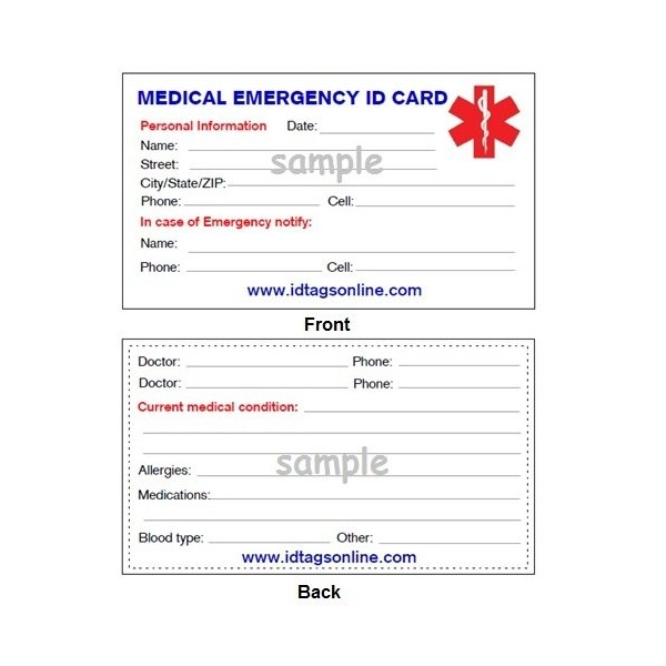 - Medical Emergency wallet cards can complement to your Medical Alert Id bracelets or Medical Id Dod Tags and Necklaces.