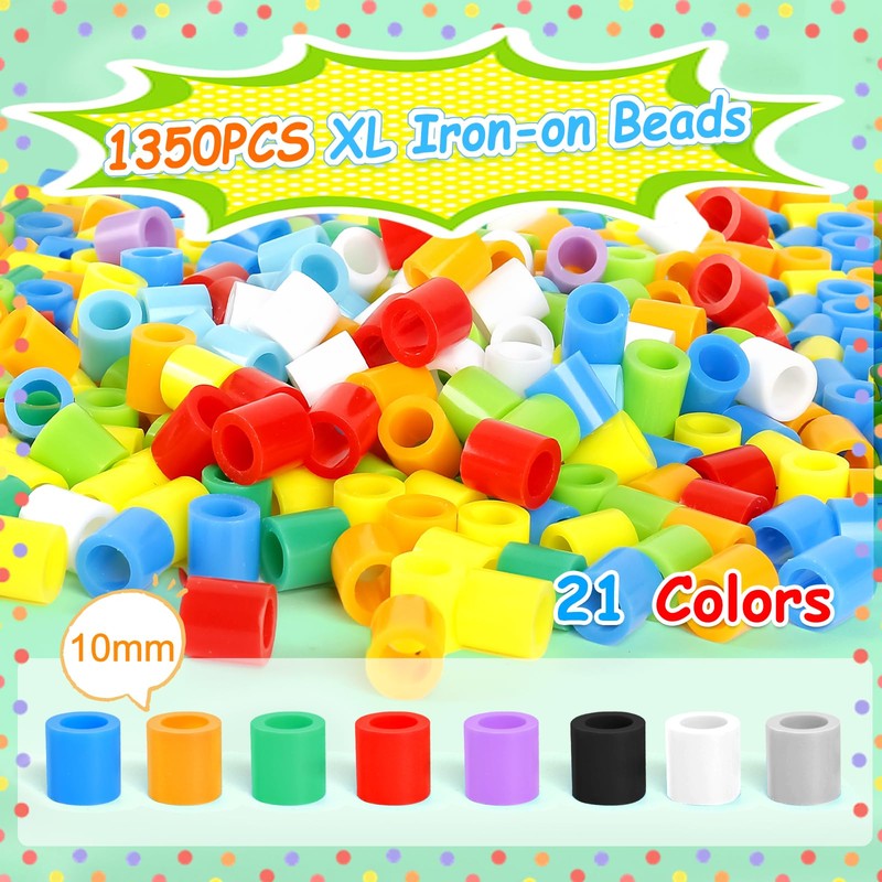 - 1350 pieces ironing beads set: with 1350 high-quality, 10 mm beads in 21 vibrant colours (e.g. white, blue, purple, yellow), children can let their imagination run wild and create a variety of designs and patterns. The beads allow children to design both simple and more complex artworks, promoting patience and problem-solving skills.