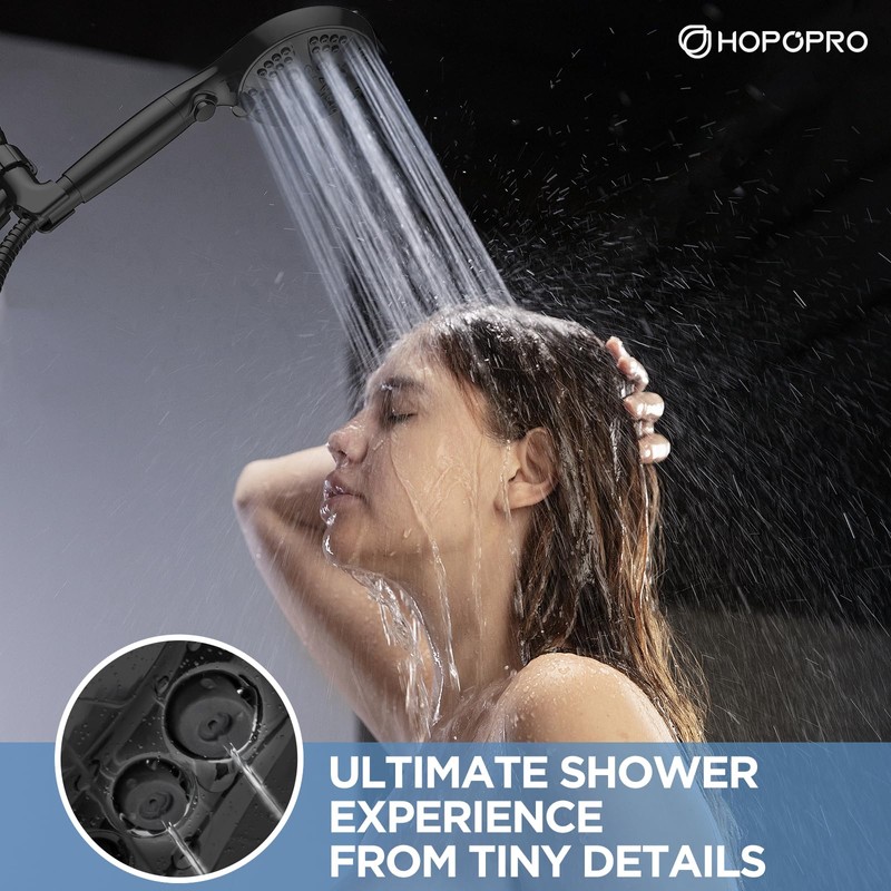 - 🚿10 Different Spray Modes: HOPOPRO newest handheld showerhead brings an ultimate luxurious shower experience with 10 different water modes for shower, including 2 unique Built-in Power Wash Modes for cleaning bathroom, Tub, Tile, Pets. The innovative broom-like super power wash mode helps to excellent cleaning effects