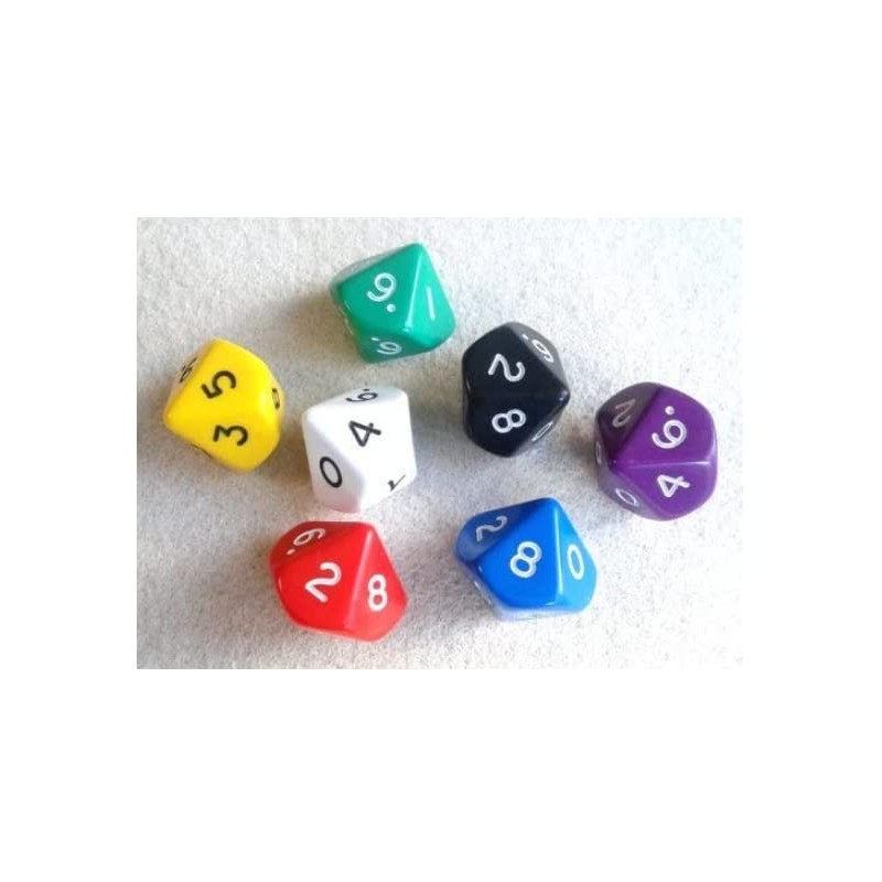 Set of 7 jumbo sizes of Opaque 10 sided dice in 7 colors.