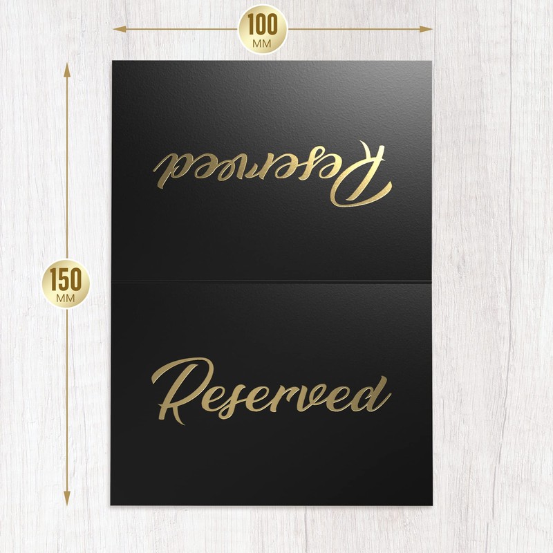 - ☑️ 10 Pack Gold Reserved Table Signs. Size: 15x10 cm double sided, Material: Cardstock, Colour: Black with gold foil