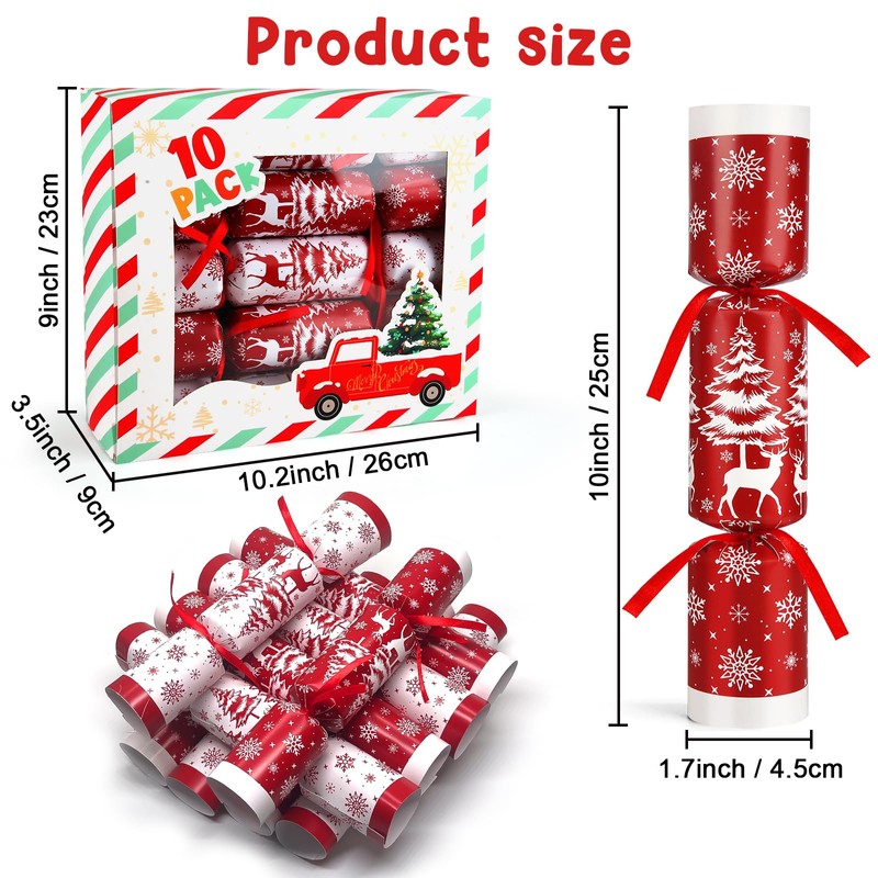 10 Pack Christmas No Snap Party Favor with Red & White Snowflake Design with Party Hat, Joke & Little Gift Inside for Kids, Xmas Gift, Christmas Seasonal Holiday Party Dinner Traditions