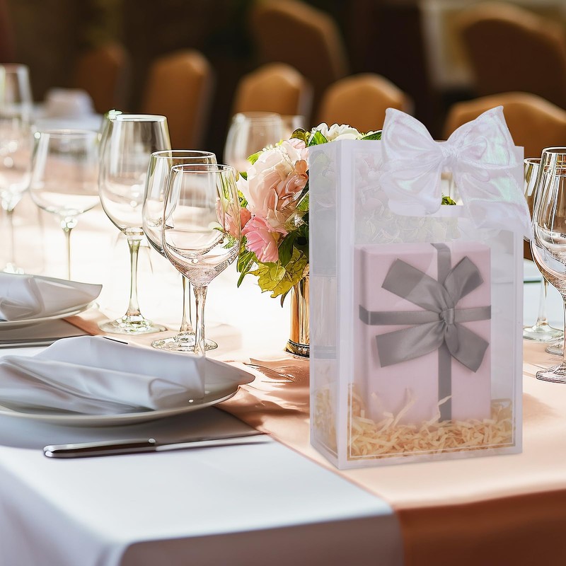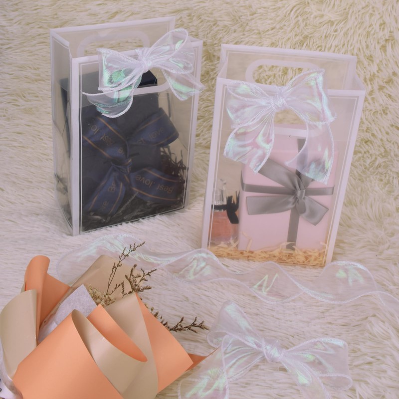 - Clear Gift Bag Size: 7.09" Lx3.15" W x 10.24" H,Ribbon: 30ft,1 roll.Great for holding small toys,dolls,candies, snacks,flowers,candles,ornaments,makeups,nail products,cups,perfumes,wallets,keys,etc.The clear gift bag with ribbon provide ample space for your present and nice decoration to wrap.