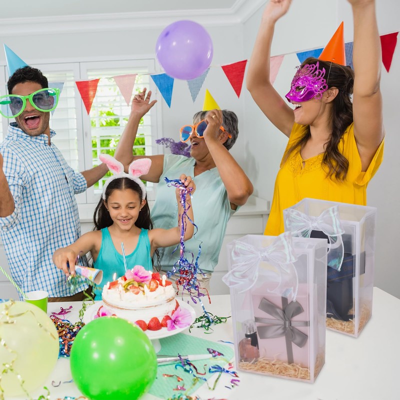 - Material: Our party favor bags are made of high quality PP plastic material,sturdy,stylish,water proof,reusable and easy to clean. Each clear gift bag comes with handles for easy portability. The bottom of the bag is square, easy to stand, free your hands and make your life easier.