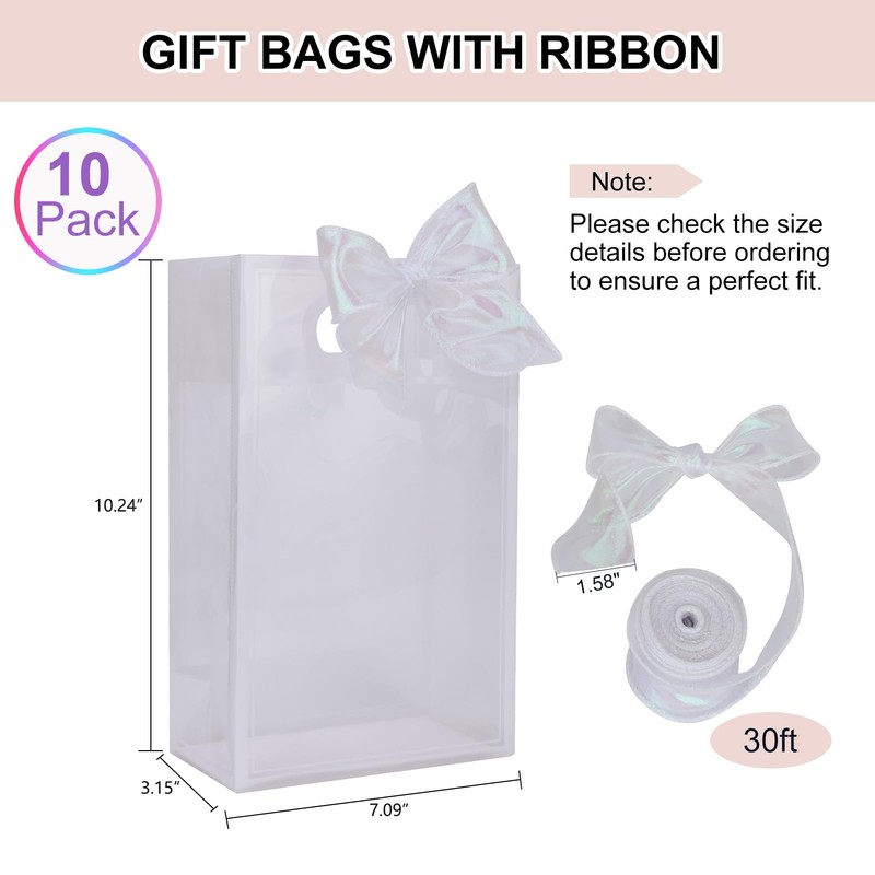 - What You Get: 10 Pack Clear Gift Bags(White),1 Roll of Ribbon.We are committed to providing a superior shopping experience to our customers.If you have any questions or problem, please feel free to let us know and we will give you a satisfactory solution.