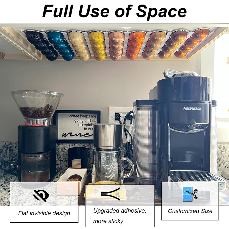 - ☕️[Special Design for Coffee Aficionado] Make Coffee Station so organization is key. This pod holder is designed for convenience with a slim profile design that will fit any coffee bar decor. Stick the strips around the bottom of the counter firmly or attach to Wall Mount and Cabinets. (Note: After installation, let it stand for 15 min, the viscosity will reach the best to increase the height and stickiness)