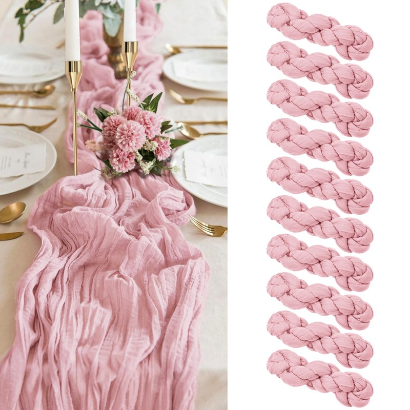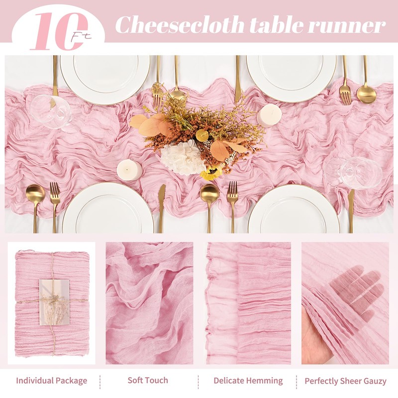 - đăProduct Includedă: You will receive pack of 10 Light Pink cheesecloth gauze table runners. Product size: 3ft in width and 10ft in length, suitable for round or square tables that can accommodate 8-10 people. The combination of 10 pack is enough to meet your daily needs. Perfect for romantic and elegant party events.
