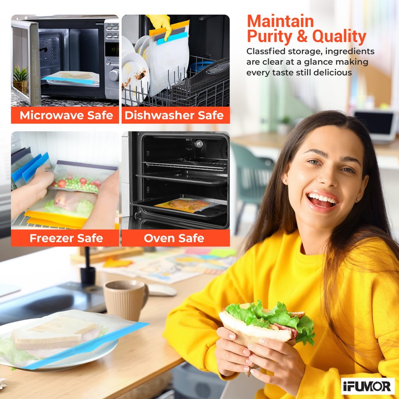 - ✅Food Grade and Reusable: Crafted from food-grade PEVA material, these reusable storage bags are PVC-free, lead-free, chloride-free, and BPA-free. This eco-friendly and recyclable material ensures they are safe for both your health and the environment. Each silicone ziplock bag can replace over 350 disposable plastic bags, offering substantial savings and contributing to a greener planet.