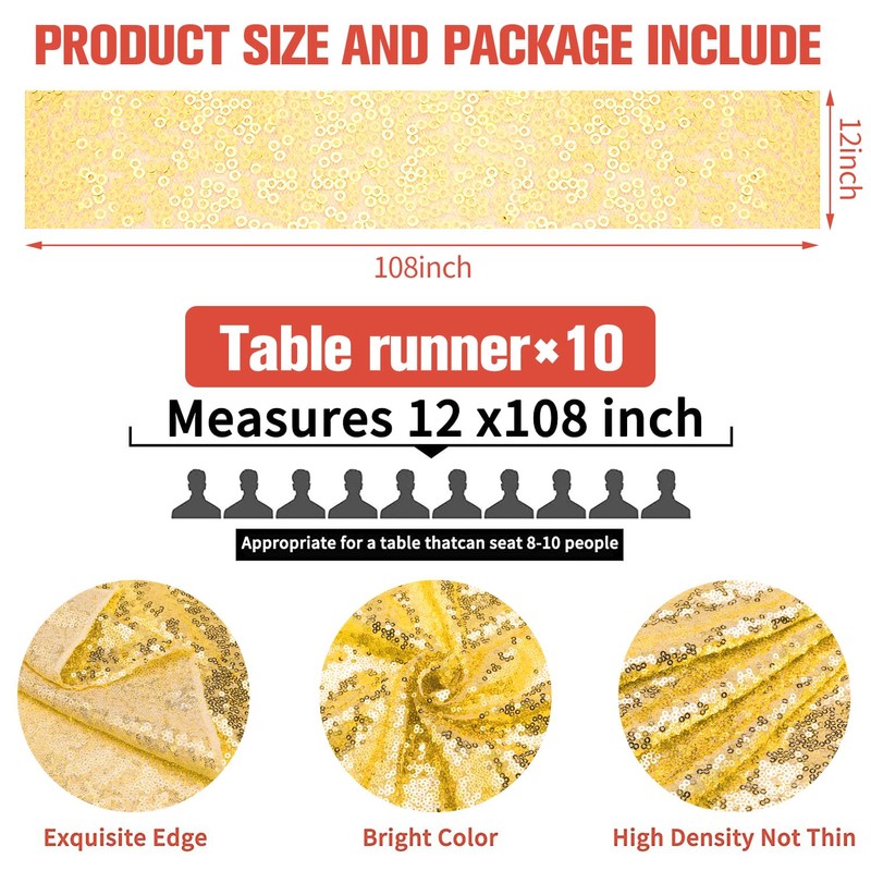• 【Set includes】10Pack rose gold sequin table runner measures 12" x 108" in size, appropriate for a table that can seat 8-10 people. This sequin table runner can fit a 6ft/8ft rectangular table or round table well.This sequin table runner is great for event table decorations.Our sequin table runner make your dining table more dazzling and outstanding.Purchase our 10-piece sequin table runner and save even more