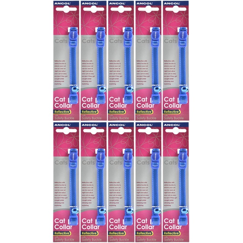 Product Description Blue glossy, adjustable and reflective cat safety collar by ancol made from tough nylon webbing backed with a reflective plastic strip for added safety. The collar becomes clearly visible at night when light from street or security lights, car headlights or torches passes over them. Will fit most cats up to 11" (28 cm) neck. Each collar has a breakaway safety buckle, designed to snap open if the cat gets caught. There are 3 striking colours to choose from, each with a complimentary coloured bell. Ancol cat collars are always beautifully crafted from quality materials in many striking colours and designs. All ancol collars also come with built in safety features, both for cats and also for birds and small mammals who may become their prey. If different colour combinations are required, please contact the seller.
