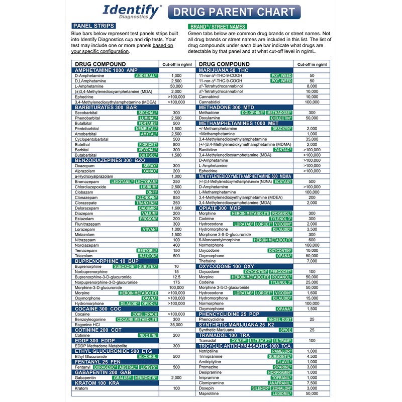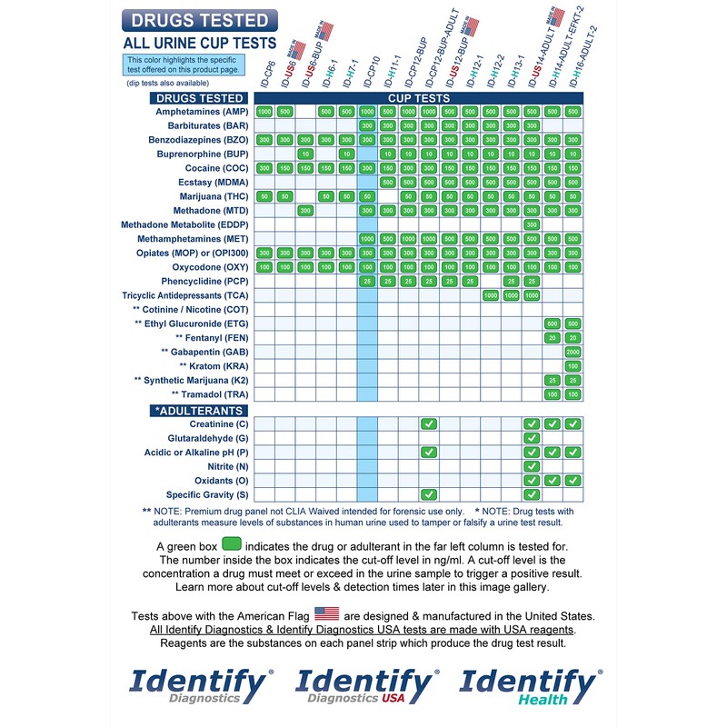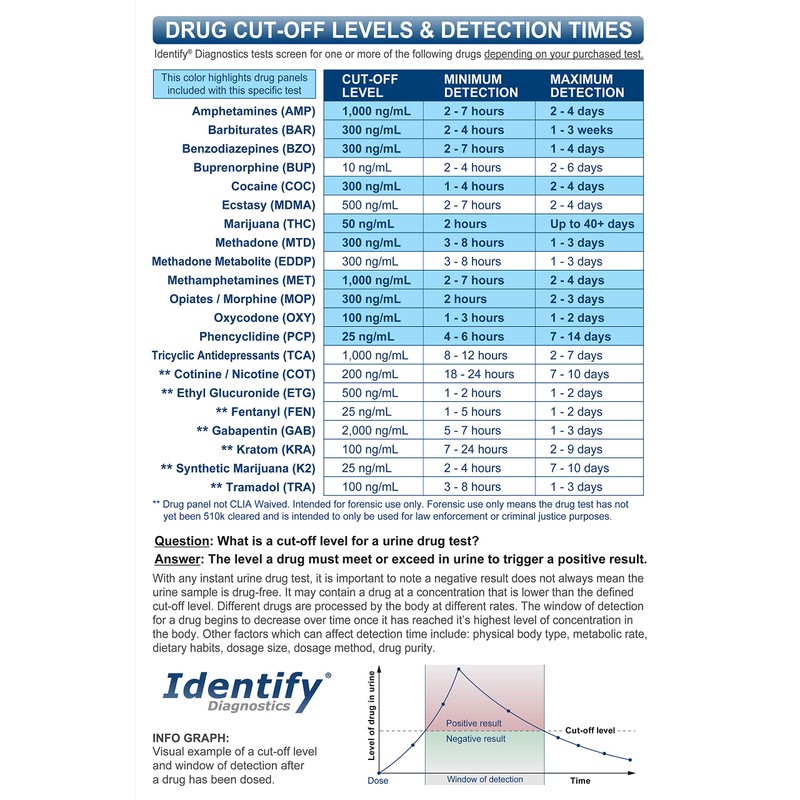 - Over 99% accuracy detecting the following according to the listed cut-off levels: AMP, BAR, BZO, COC, MET, MOP, MTD, OXY, PCP, THC.