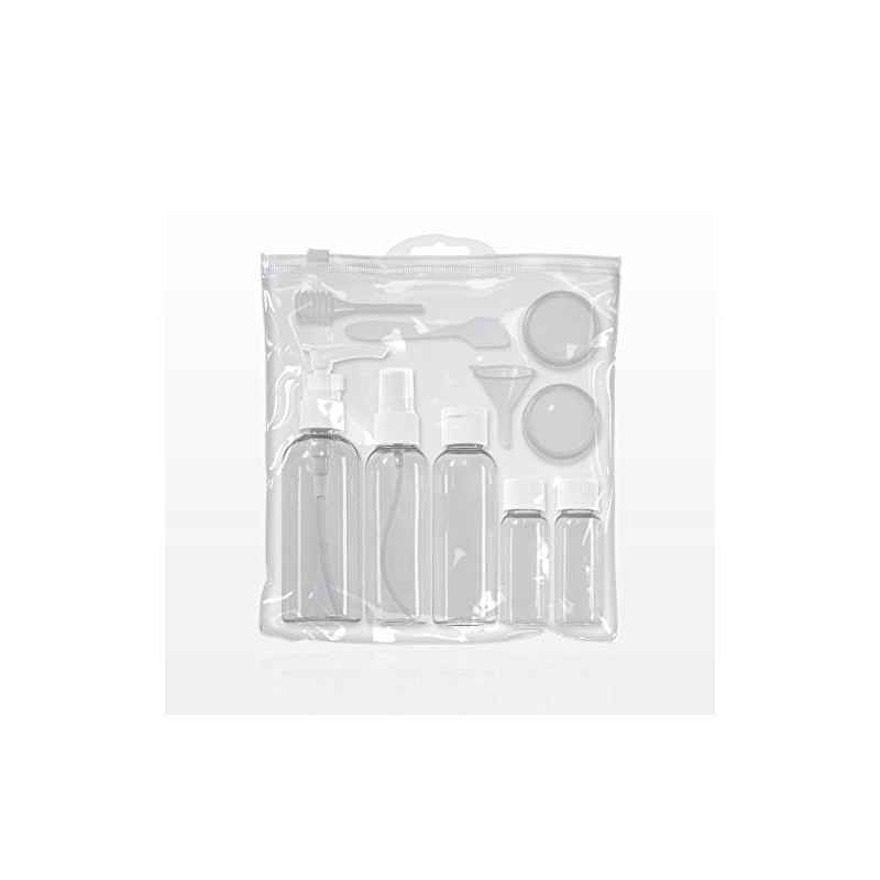 - VARIETY OF BOTTLES AND CONTAINERS - Includes (1) 2 oz Pump bottle, (1) 2 oz Spray Bottle, (1) 2 oz flip top cap botttle, (2) 0.5 oz screw top bottles, (2) 0.5 oz jars with screw top lids, (1) Spatula, (1) Pipette for transferring liquids, (1) Mini funnel, (1) Waterproof Clear Zip Pouch
