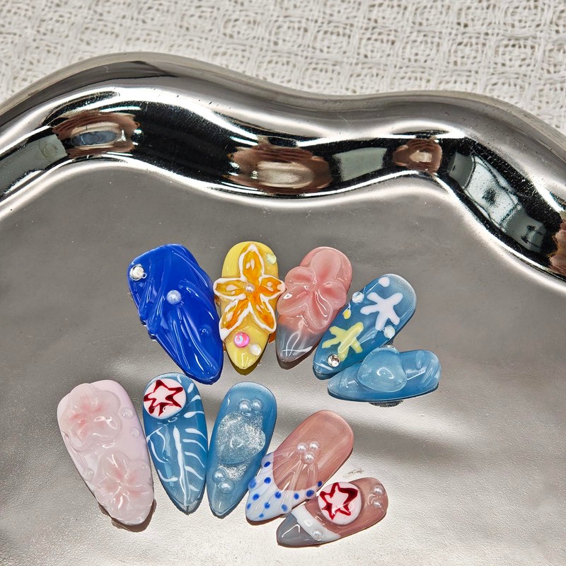 10 Pcs Blue French Tip Press on Nails Handmade Medium Almond Fake Nails with 3D Flower Starfish Design Muti-Layer Gel False Nails Thick Acrylic Nails Press ons Summer Beach Nails for Women (S)