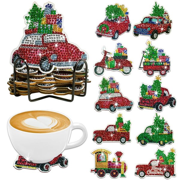 10 Pcs Diamond Painting Coasters with Holder, 5D DIY Christmas Coasters Diamond Painting Kits Round Diamond Art Cup Drink Coasters with Christmas Pattern Art Craft Supplies for Christmas (Car)