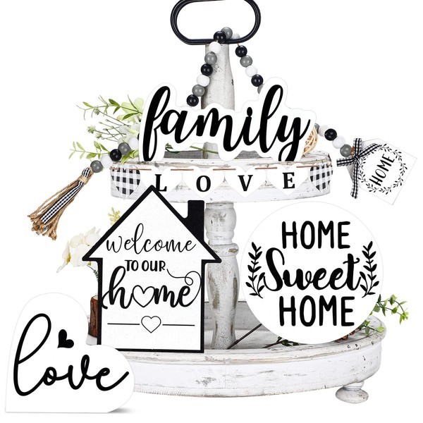 - Home Heart Style Decoration: our rustic kitchen items are designed with many home elements, printed with warm words, such as [Welcome to our home], [Home Sweet home] and more; The combination of green leaves and artistic fonts adds more charm to these tiered tray decorations, to bring you an elegant atmosphere at home