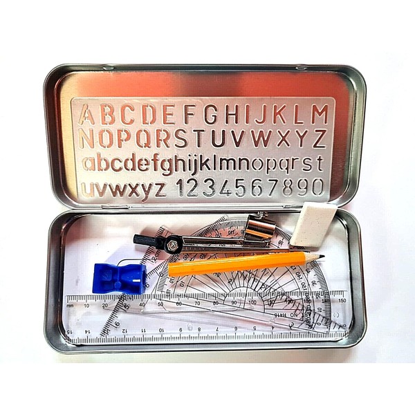 - Eraser Sharpener 15cm Ruler HB Pencil Compass 2 x Set Squares A - Z and 0 - 9 Upper and Lower case stencil