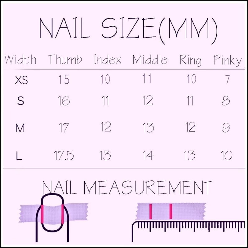 - Size Selection: Please refer to the size chart in the product details to match your nail size. If you are between two sizes, it is recommended to choose a slightly larger size, which can make your fingers more comfortable