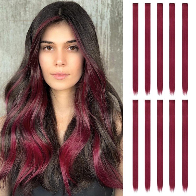 10 Pcs Red Hair Extensions | 22 In Long Straight Fake Hair | Clip In Hair Extension | Hair Accessories for Girls (Dark Red)