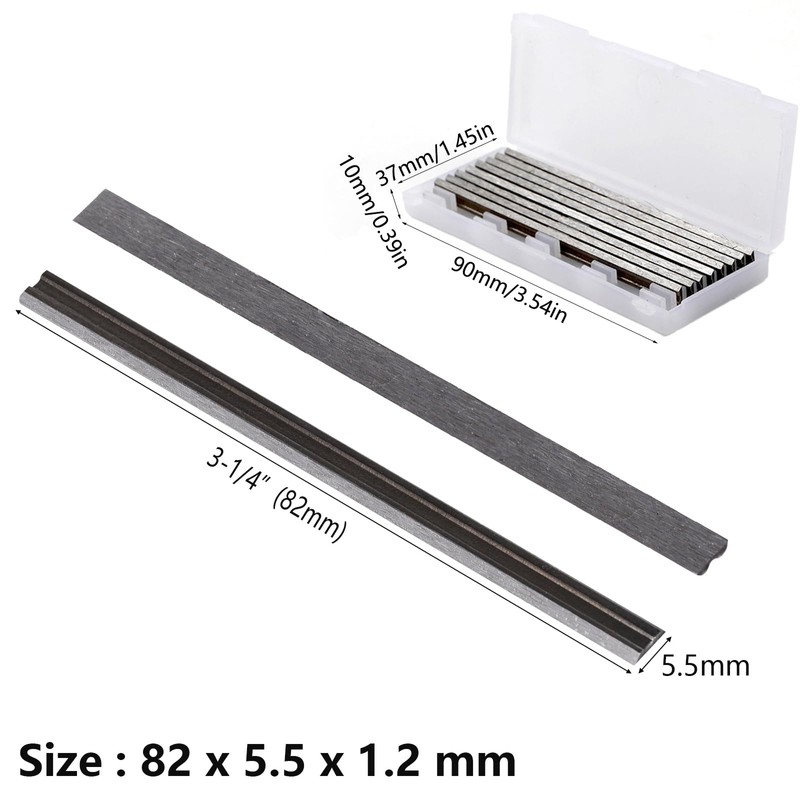 【Size】10Pcs cross cut planer blades with the size of 82*5.5*1.1mm/3.22*0.21*0.04in, compatible with most of the 3-1/4 inch handheld or power planers on the market. A total of 10 blades are convenient for your daily use and replacement.