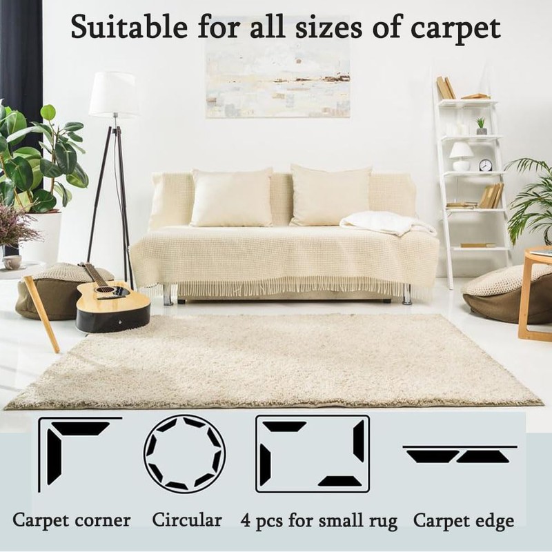 How to Use: 1. Tear off the white protetive paper on the rug gripper back. 2. Stick the rug gripper on the back of the rug corner. 3. Tear off the protective film on the rug gripper. 4. Stick the rug on the floor and press to fix the rug.