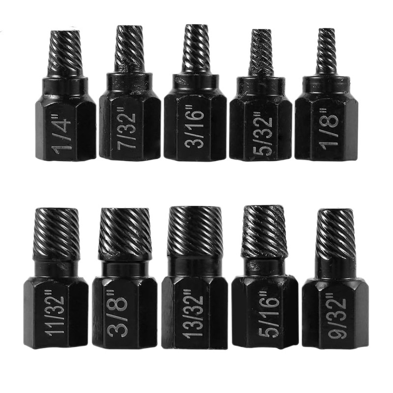- Size: The dimensions of the screw extractor set include: 1/8", 5/32", 3/16", 7/32", 1/4", 9/32" 5/16", 11/32", 3/8",13/32"