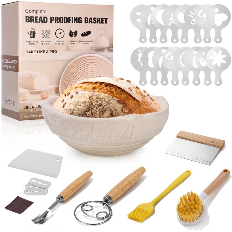 - Complete baking set: 9 inches/23 cm round proofing basket, linen lining, baking mat, dough whisk, dough scraper, bowl scraper, bread cutting tool with 4 blades, silicone brush, flour dust, cleaning brush, 16 pieces baking stencils, you can easily shape, cut and decorate the surface.