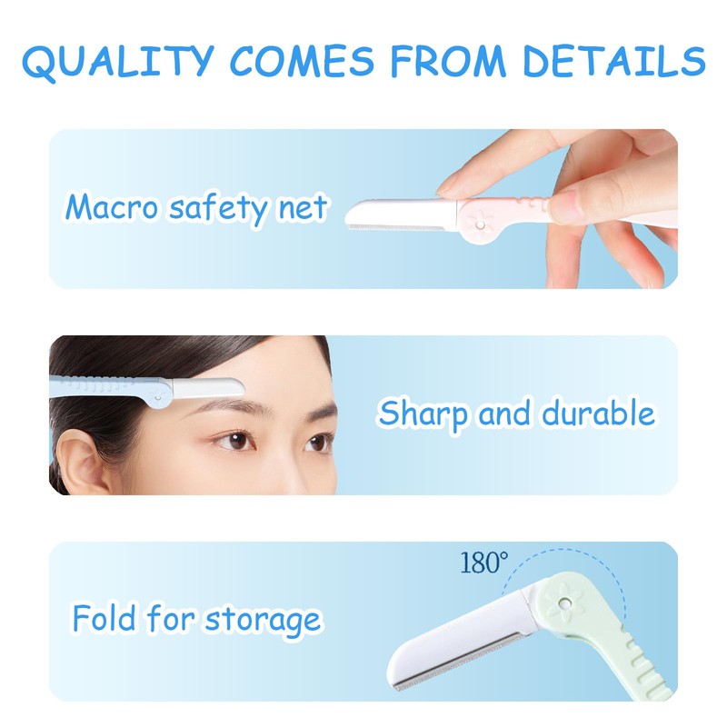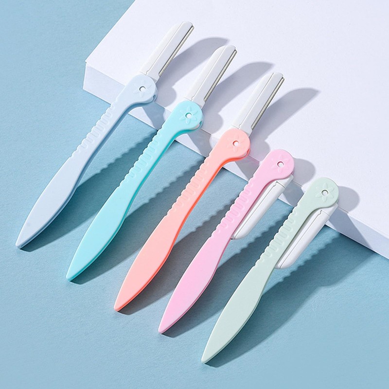 - Quantity: 10 stainless steel eyebrow trimming tools, including 4 green, 3 blue, and 3 pink.