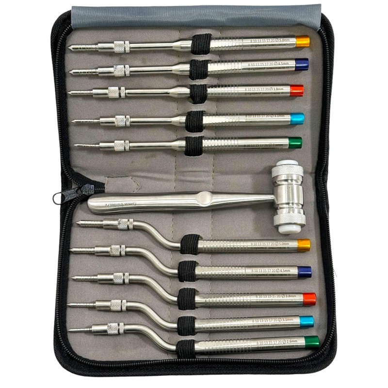 - Includes: 5 Offset Osteotomes + 5 Straight Osteotomes + Mead Mallet + Pouch Case