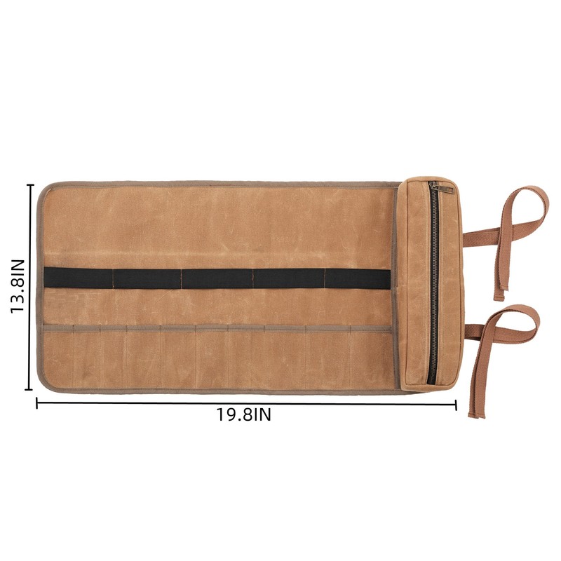 10 Pockets Tool Roll Bag, Robust 16 oz Waxed Cotton Canvas Tool Bag with 2 Wrap Straps, Multi-Purpose Tool Bag for Metric, SAE (Khaki)