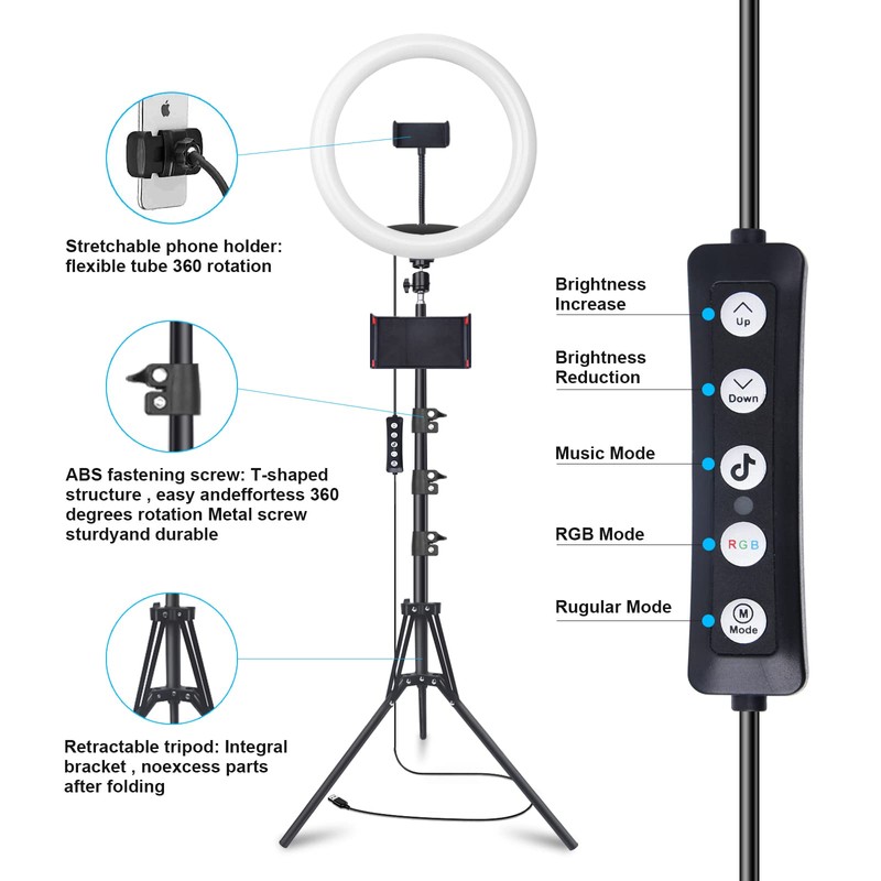 - 【Upgraded Dimmable RGB Ring Lights】:RGB ring light features 3 traditional lighting modes (white light, warm light and natural light modes) with 12 levels brightness with 1% to 100% dimming range to create a unique atmosphere. Ring light with 38 dynamic modes and 10 colors static RGB modes (red, green, blue, yellow, Pink, cyan-blue, Seven-color jump, seven color gradient,seven color horse racing, Magic color), plus flash/fade/breath RGB cycle modes, more than 200 lighting options to choose from.