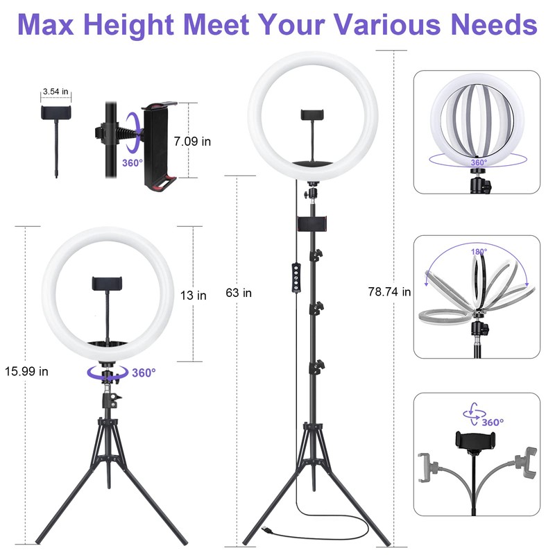 - 【Stable Tripod Stand】: standing tripod adopt superior aluminum alloy, equipped with weighted tripod base to increase stability, very stable when supporting the ring light and your phone, so it won't tip over. Standing tripod extends from 15.7" to 63", it’s the best ring light kit choice no matter using on the table or floor..