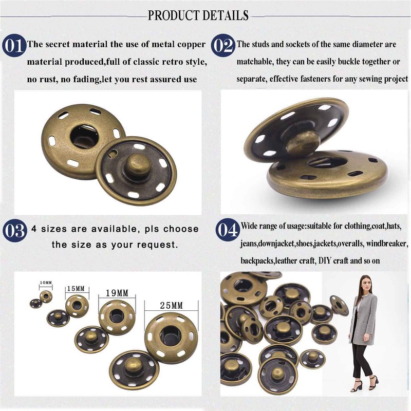 10 Sets Antique Brass Sew On Snap Fasteners Metal Snap Button Rust Proof Press Studs (25mm)