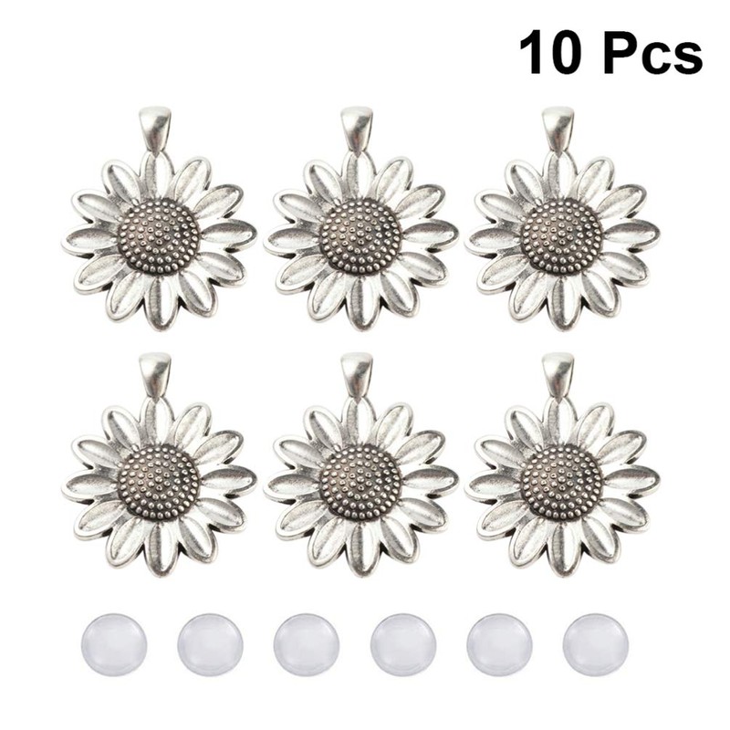 10 Sets Sun Flower Pendant Trays Clear Glass Cameo Setting Cabocho Dome Antique Pendants Blank Trays Bezel for Cameo Pendants Photo Jewelry Necklace Crafts Silver 18mm