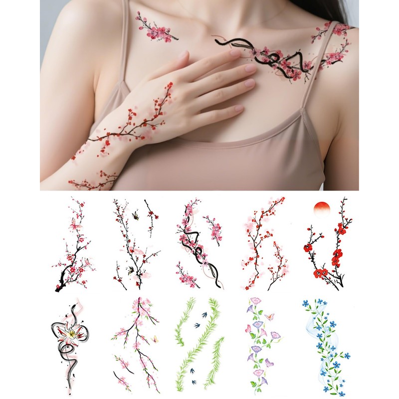 - 10 Sheets Floral Temporary Tattoos: Temporary tattoos for women adults, collarbone arm body tattoos, temporary face arm ring tattoo stickers, paper tattoo adhesive. Flower tattoo design, plum blossom, morning glory, multi-color. The sheet measures 6.29 inches long and 3.54 inches wide